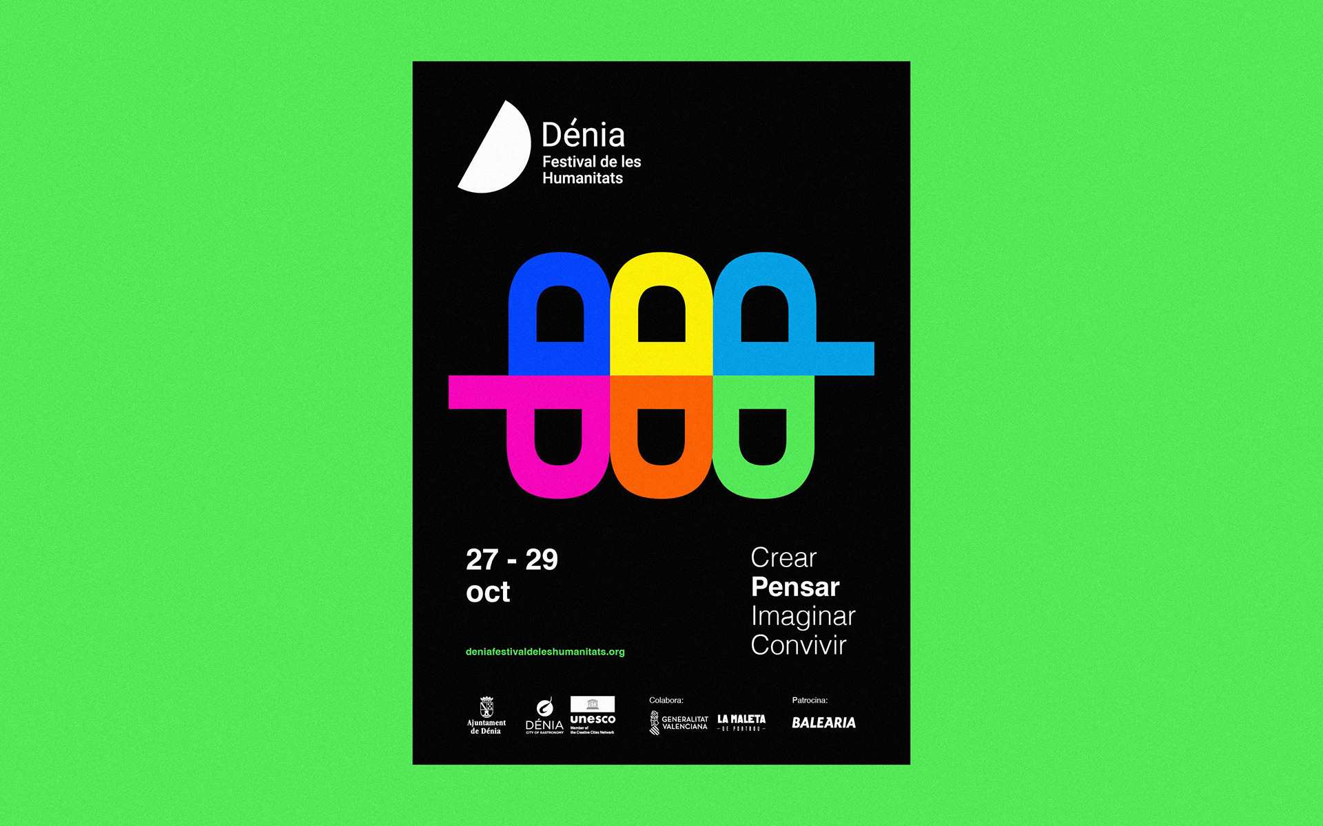 En Dénia se celebra el Festival de las Humanidades con charlas, conferencias, reflexiones y filosofía sobre temas de la actualidad. Nos encargaron el diseño y la dirección artística de la comunicación de todo el festival. Las 4 palabras que lo definen son pensar, crear, imaginar y convivir, teniendo que adoptar gran protagonismo en las gráficas.